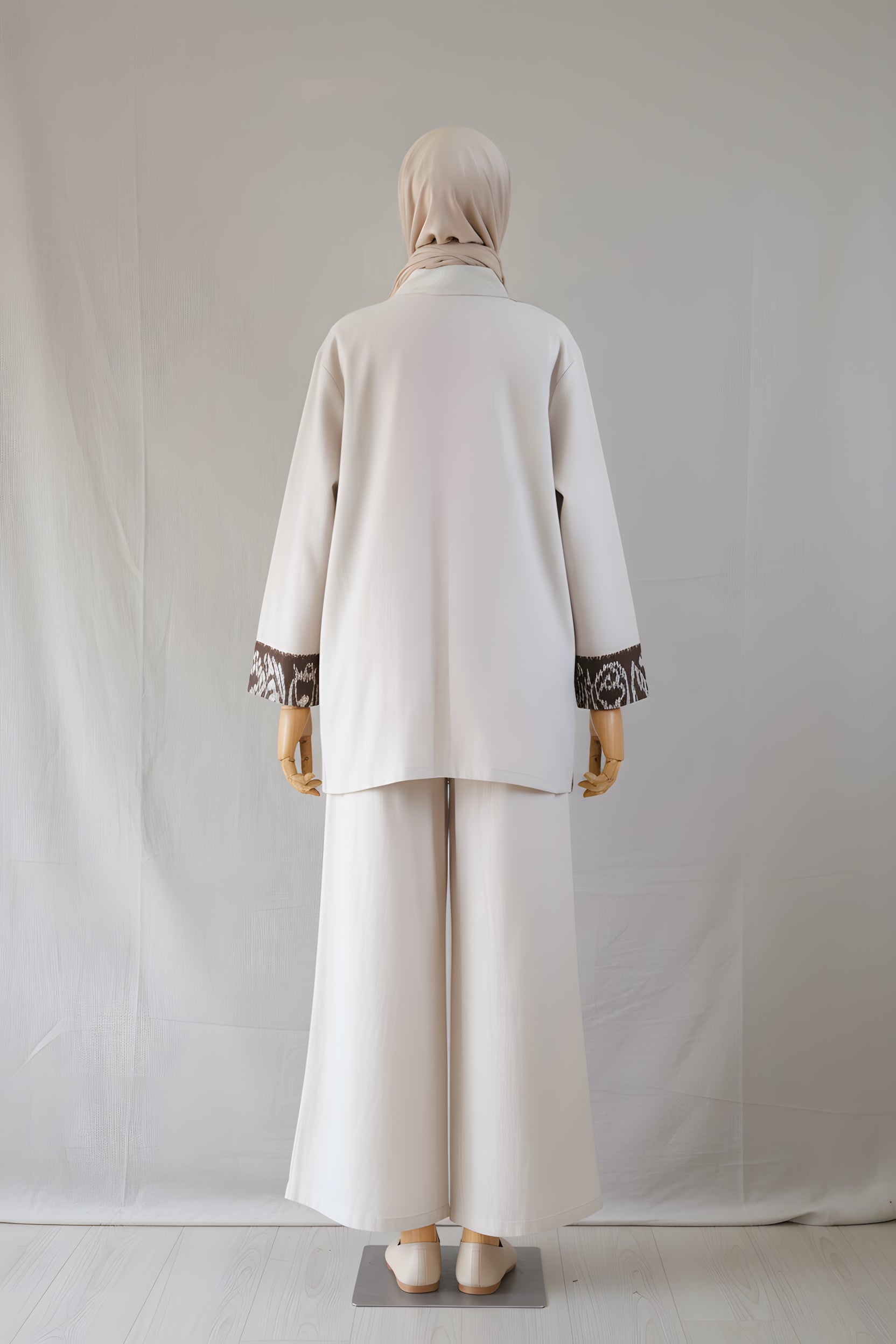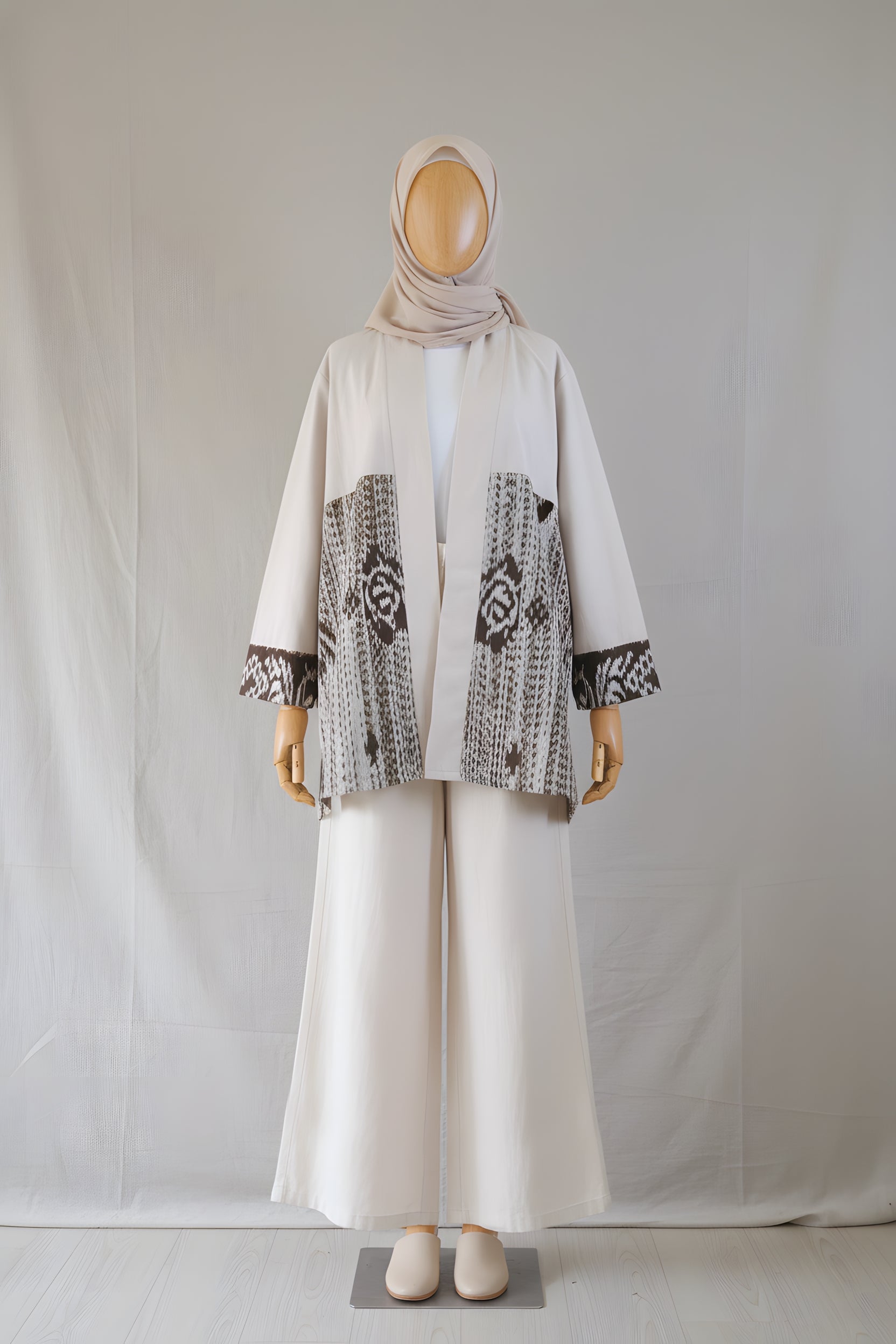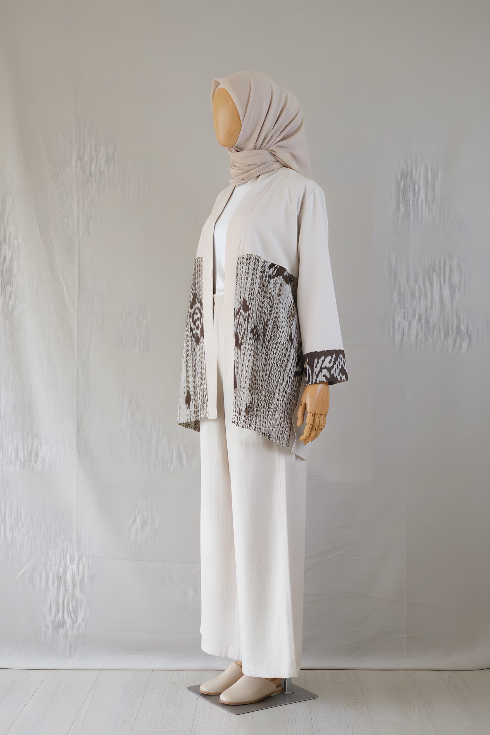 This Belza Beige Tenun Outer combines smooth Blanket Troso woven fabric with durable Oxford material. Featuring long sleeves and an open front, its kimono-style design comes in warm beige and brown tones for a sophisticated look.