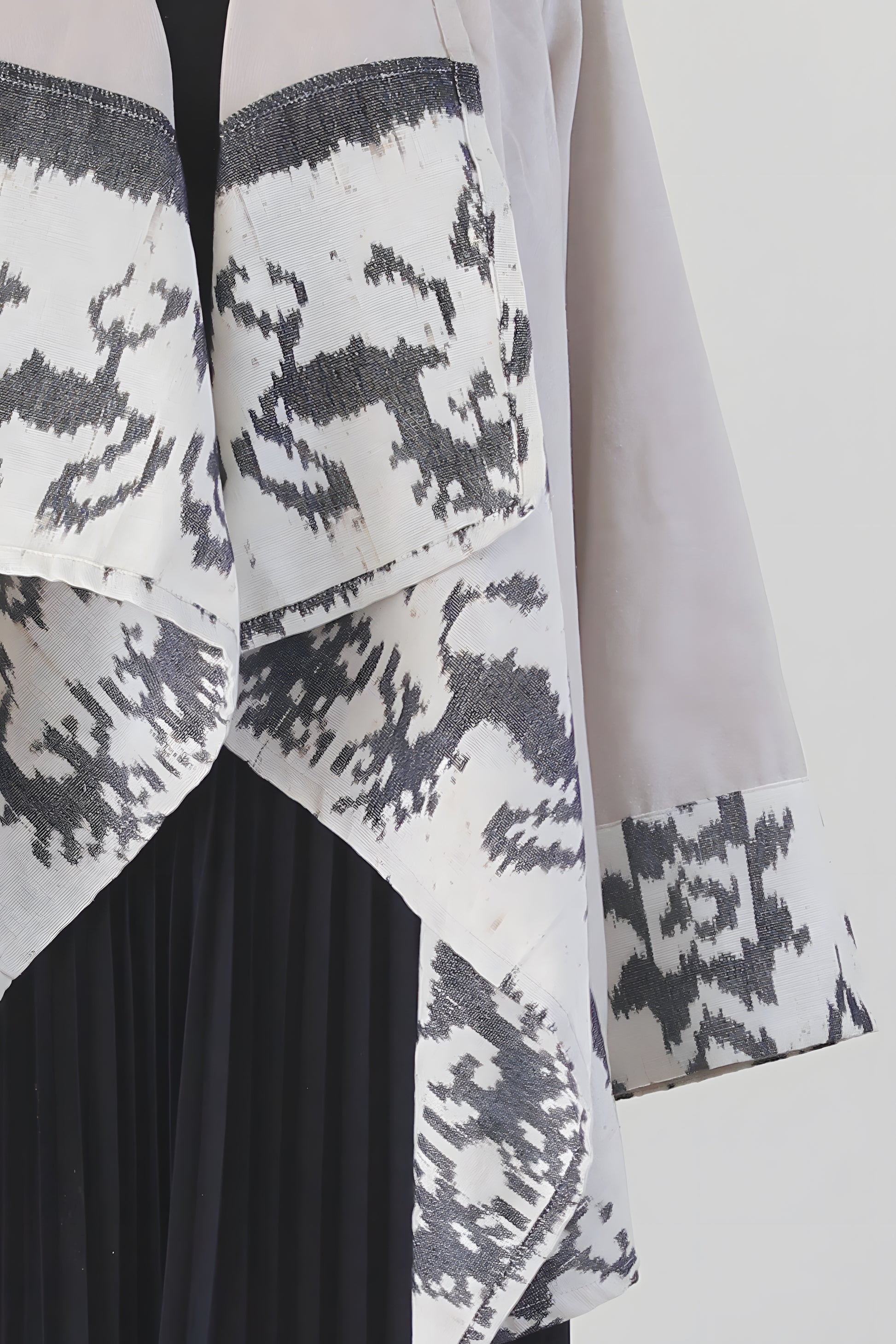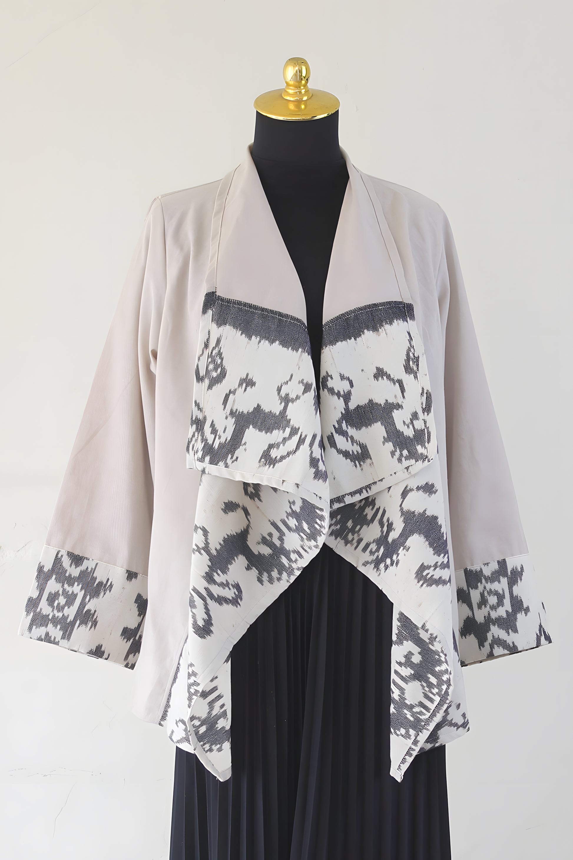 This Heza outerwear combines smooth Troso woven fabric with durable Oxford fabric, featuring long sleeves and an open front design. Its elegant beige and white palette adds a refined touch, offering both style and comfort for your wardrobe.