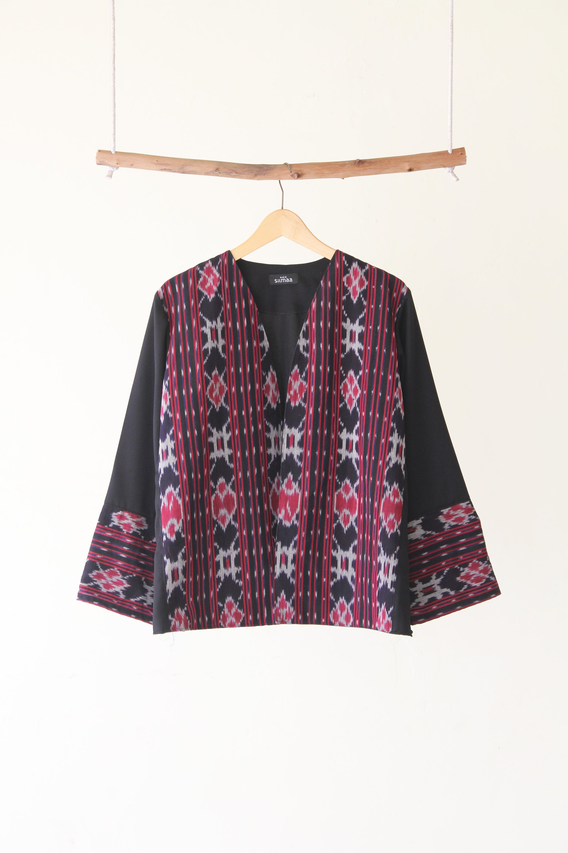 Elevate your style with this elegant outer featuring fine tenun craftsmanship and a vibrant rainbow twill. The symmetrical tenun pattern adds a touch of sophistication, while the open front and long sleeves provide effortless comfort. Presented in striking black, red, and white hues, this piece makes a bold fashion statement.