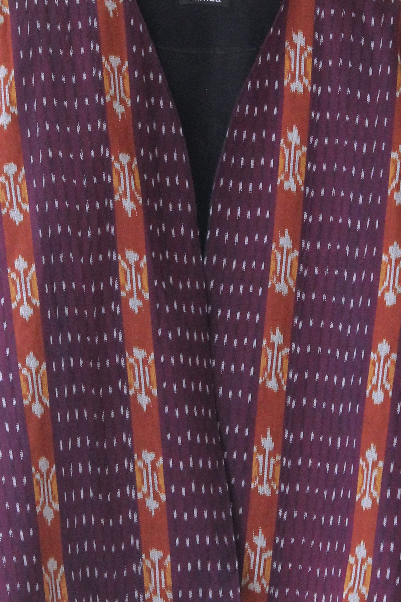 This Freya Burgundy Tenun Outer features delicate woven and rainbow twill fabric, long sleeves, and an open neckline. Its relaxed fit and open front design offer effortless style and comfort, all highlighted in a rich burgundy shade.