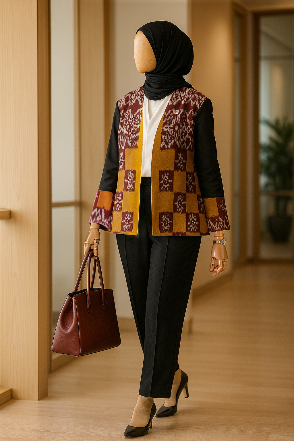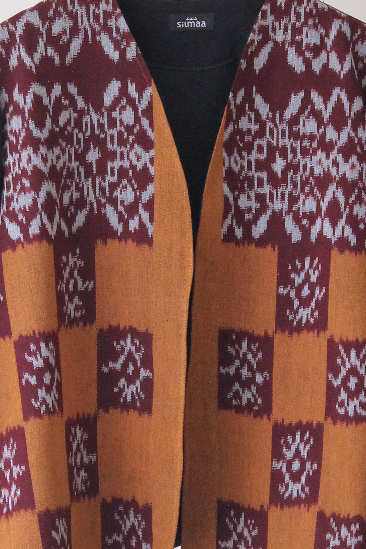 Experience the Freya Mustard Tenun Outer, crafted from fine tenun and vibrant rainbow twill fabric. Featuring long sleeves and an open neckline, this outerwear in mustard and burgundy offers a relaxed, loose fit with an open front design, perfect for effortless style and comfort.