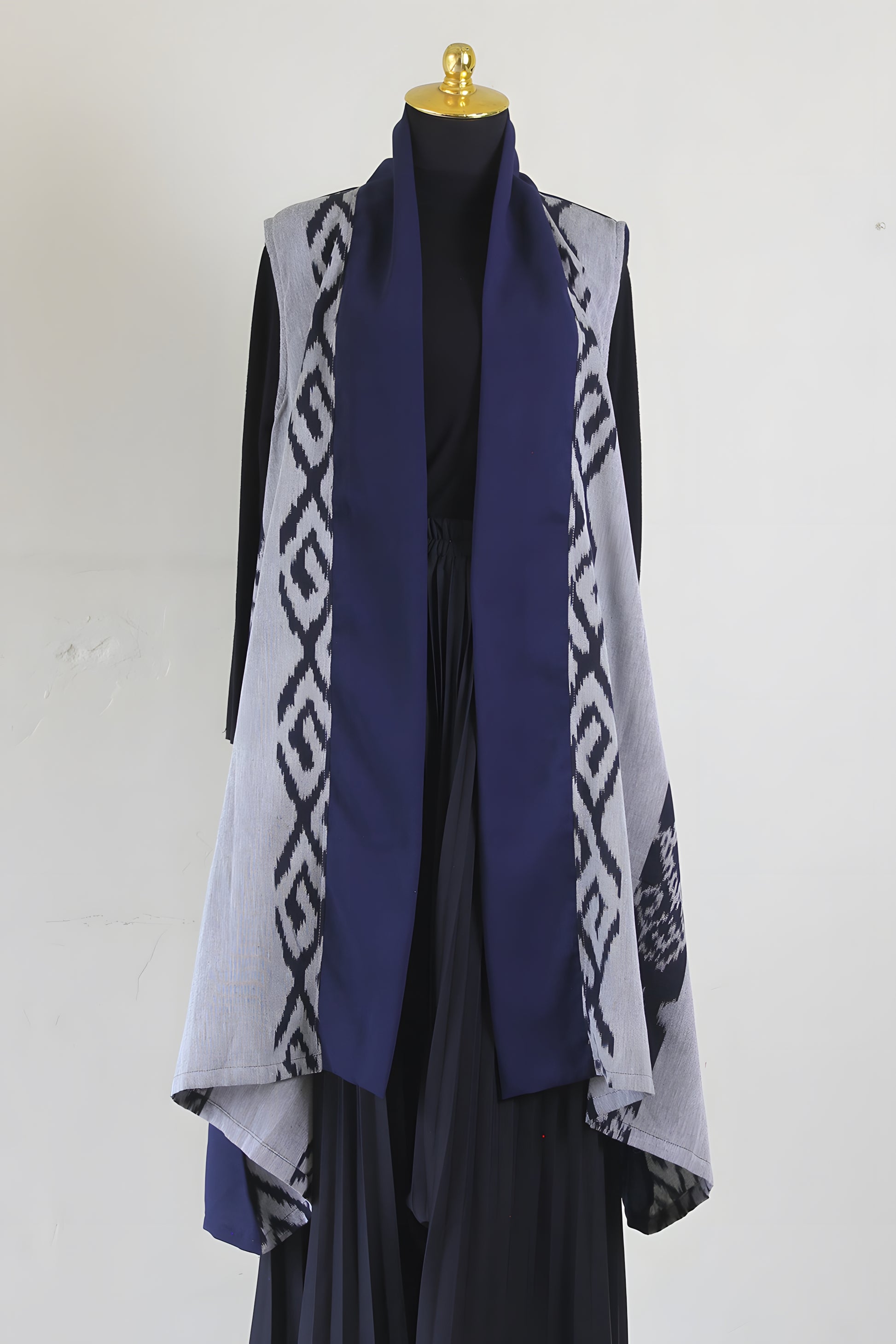 Experience elegance with the Kila Navy Grey III Tenun Long Vest, crafted from fine Blanket Troso woven fabric and soft Woolpeach. This sleeveless design features a stylish foldable collar and extends into a flattering long vest silhouette in a sophisticated navy grey shade. Elevate your wardrobe with timeless comfort and refined style.