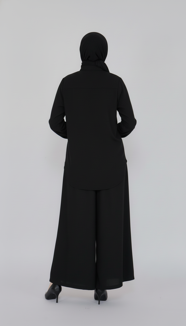 Master minimalist style with this essential black duo. The Nora shirt features long sleeves, a classic collar, and textured key crinkle fabric, while the Hannah culotte offers a graceful palazzo cut with hidden pockets. Both pieces in matching crinkle texture create a cohesive, versatile set perfect for effortless everyday elegance.
